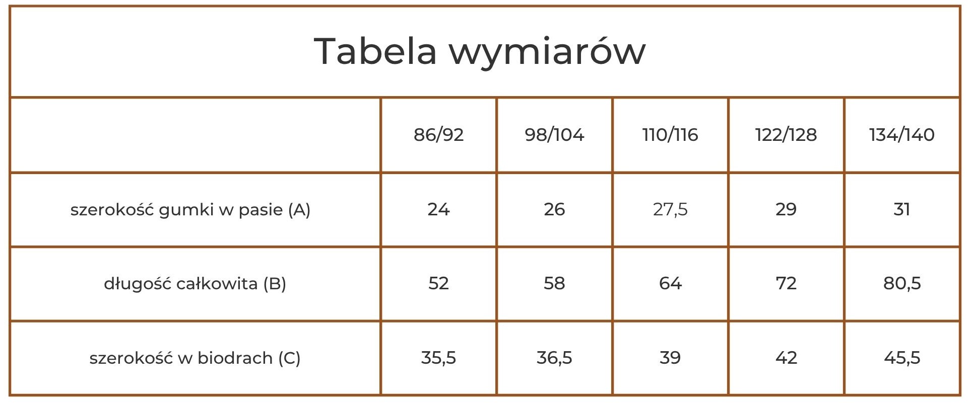 Najłatwiej wybrać odpowiedni dla Waszego dziecka rozmiar porównując wymiary aktualnie noszonych przez maluszka ubrań z strojmisiową tabelą wymiarów.